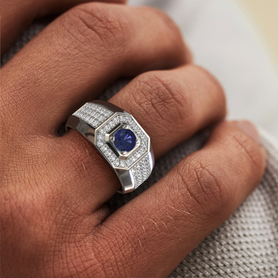 Are you looking for a modern platinum men's ring that is slightly different? Then our wide platinum sapphire set Pavan men's ring is the perfect ring for you! This ring, as shown here, is made of platinum but feel free to customize to your liking. Show them what you are all about with this platinum sapphire Pavan men's ring, a ring for ambitious men. The royal Pavan men's ring, as shown here, can be customized to your liking. Our online tool offers many different options but please feel free to contact us if you want changes made to your Pavan men's ring, which are unavailable in our online tool.