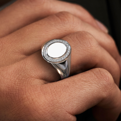 The oval Adam 1 pinky ring with oval shape white enamel stone top, as shown above, is filled with tradition. Customary, the pinky ring was passed down from father to son. Start your own tradition with this oval white gold pinky ring. We are also more than happy to engrave your ring with a monogram or family crest. Please check our database for further inquiries and options. You can find the departments of our education centre at the bottom of this page. Start a new tradition with the exclusive white gold Adam 1 pinky ring. Customize your own special Adam 1 signet ring, which will then be created by our goldsmiths with great passion. Do you prefer a different option than is shown here in the white gold Adam 1 signet ring? Then our online tools offers various options. Feel free to ask us for help if you are unable to succeed. We are happy to answer your questions!Our team of talented, passionate designers add new ring designs to our online collection daily. Our objective in doing so, is to be able to offer you a wide variety of jewels. Please feel free to request a quote if you have specific wishes for your ring. We guarantee to make you an offer you can't refuse.After receiving your order, our goldsmiths will passionately start the creative process of making your ring in our own studio. Because we don't have a big stockpile, these costs will not be passed on to you. Our pricing is proof of that! We offer top quality jewels at lowest price, guaranteed.To make it easier for you, we offer a 30 day return policy. Check our terms and conditions.