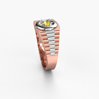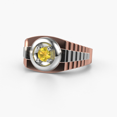 Everyone knows the design of this well-known watch brand. With two colours of rose gold links, this solid 14 Carat rose gold Edward men's ring, is perfectly suited for trendy, successful men. A man who wants to dress to impress with a striking men's ring with 4.7 mm yellow sapphire. Show them what you are made of!How do you like this exclusive rose gold men's ring? Simply customize this Edward men's ring, using our online tool. Subsequently, your personal daring Edward men's ring will be made by hand by our goldsmiths. Precious metals and gemstones can be customized to your liking. Do you have specific preferences which are unavailable in our online tool? Please feel free to contact us. We will customize your personal exclusive men's ring to your liking.Our talented designers add new designs to our online collection daily. Together they create a diverse collection of the finest jewellery. If you prefer to make a ring according your own design, please feel free to request a quote. We will make you an amazing offer, based on quality and price.Because we design and deliver our own rings, we can offer you a ring at a price you won't find anywhere else. A ring is made to order, which helps prevent excess supplies, so we can make you a great price offer. We understand it feels risky, buying your ring online, but we will gladly assist in the designing process, taking your budget into consideration.To make it easier for you, we offer a 30 day return policy. Check our terms and conditions.