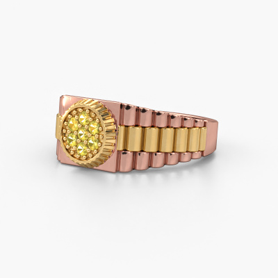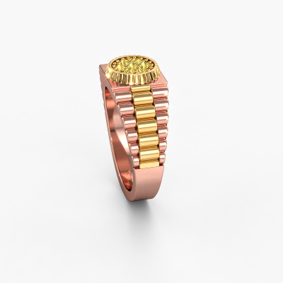 Everyone knows the design of this well-known watch brand. With two colours of rose gold links, this solid 14 Carat rose gold Nout men's ring, is perfectly suited for trendy, successful men. A man who wants to dress to impress with a striking men's ring with 2 mm yellow sapphire. Show them what you are made of!Our goldsmiths passionately create your customized men's ring to your liking with the utmost care. The rose gold men's ring, as shown here, can be customized using our online tool. Feel free to ask our jewel designers for assistance if you want changes made which are unavailable in our online tool. We are happy to answer your questions.New jewellery designs are added to our online collection daily. Our team of passionate designers strive to create extraordinary and diverse designs. Have you seen a ring you like? Please feel free to contact us. Based on a good price/ quality ratio, we will make you an offer you can't refuse!By using our modern techniques, we can design and customize the finest quality jewels with the utmost care for you. Our rings are always priced 30 percent lower than other jewellers. We make rings to order, so we don't have to maintain a large stock. If you have a certain budget, we are more than happy to advice you accordingly.To make it easier for you, we offer a 30 day return policy. Check our terms and conditions.