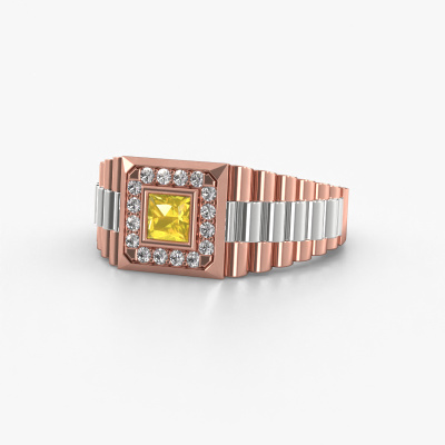 Everyone knows the design of this well-known watch brand. With two colours of rose gold links, this solid 14 Carat rose gold Zilan men's ring, is perfectly suited for trendy, successful men. A man who wants to dress to impress with a striking men's ring with 4 mm yellow sapphire. Show them what you are made of!Customize your own special Zilan men's ring, which will then be created by our goldsmiths with great passion. Do you prefer a different option than is shown here in the rose gold Zilan men's ring? Then our online tools offers various options. Feel free to ask us for help if you are unable to succeed. We are happy to answer your questions!Our team of talented, passionate designers add new ring designs to our online collection daily. Our objective in doing so, is to be able to offer you a wide variety of jewels. Please feel free to request a quote if you have specific wishes for your ring. We guarantee to make you an offer you can't refuse.After receiving your order, our goldsmiths will start the creative process of making your Zilan ring. We don't keep stock. This is advantageous because these costs will not be passed on to you. Therefore, we can offer jewellery at exceptionally low prices.To make it easier for you, we offer a 30 day return policy. Check our terms and conditions.