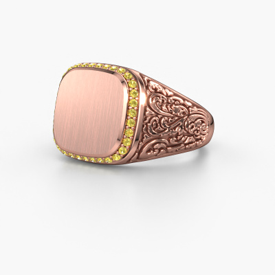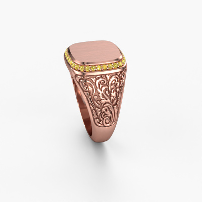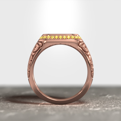 Dress to impress with this heavy Jesse 2 men's ring, because with the right ring you make a strong personal statement. This Jesse 2 special men's ring is shown in 14 Carat rose gold. If this doesn't suit your style, feel free to customize the precious metal to your liking. After all, you want a men's ring that matches your style. A ring that truly suits you. One saying: This is who I am!The best part of this special signet ring is that you can customize it to your own liking. Your style, your choice, your signet ring. On top of that, your vintage rose gold signet ring will be made by hand with eco-friendly materials! Please feel free to easily customize the ring, using our online tool. Of course, you can always contact us. We will gladly help you compiling your vintage signet ring. Is there a design you like, but you would like to customize it with a gemstone we do not offer on our website, then please contact us. We're happy to tell you about the possibilities.