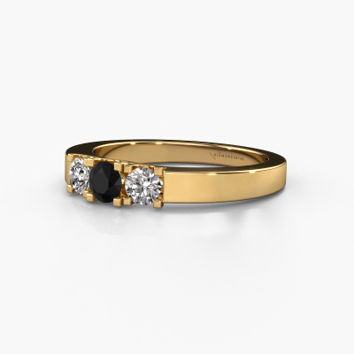 This extraordinary ring is called Selina 1. This type of ring is known as a memoire ring, because its gemstones are set in a continuous line. This makes it easy to combine with other rings. The band of this 14 Carat gold ring is set in a combination of black diamond and diamond 0.54 crt. You can easily choose the combination you prefer online. As you can see, a single black diamond is set in this single alliance gold ring. The memoire ring represents collaboration. And that is precisely what these gemstones do, collaborate. Together they add a beautiful effect to the band of a modern ring! Such a meaningful ring, wouldn't you agree? All our hand selected black diamonds are positioned by hand by our expert goldsmith. It's a precise task, which can only be completed successfully through the combination of pure craftsmanship and usage of the latest techniques which give it an optimal effect. To create a perfect reflection of light, all the gemstones have to be perfectly aligned in the same way. During manufacturing, the expert goldsmith will therefore monitor the reflection of light constantly to check whether the black diamonds are aligned properly. This requires a skilled hand and a lot of patience but then the end product will be a true piece of art. And that is our mission!By using our modern techniques, we can design and customize the finest quality jewels with the utmost care for you. Our rings are always priced 30 percent lower than other jewellers. We make rings to order, so we don't have to maintain a large stock. If you have a certain budget, we are more than happy to advice you accordingly.New jewellery designs are added to our online collection daily. Our team of passionate designers strive to create extraordinary and diverse designs. Have you seen a ring you like? Please feel free to contact us. Based on a good price/ quality ratio, we will make you an offer you can't refuse!To make it easier for you, we offer a 30 day return policy. Check our terms and conditions.