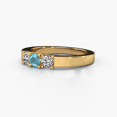 This extraordinary ring is called Selina 1. This type of ring is known as a memoire ring, because its gemstones are set in a continuous line. This makes it easy to combine with other rings. The band of this 14 Carat gold ring is set in a combination of blue topaz and diamond 3.7 mm. You can easily choose the combination you prefer online. As you can see, a single blue topaz is set in this single alliance gold ring. The memoire ring represents collaboration. And that is precisely what these gemstones do, collaborate. Together they add a beautiful effect to the band of a modern ring! Such a meaningful ring, wouldn't you agree? All our hand selected blue topaz are positioned by hand by our expert goldsmith. It's a precise task, which can only be completed successfully through the combination of pure craftsmanship and usage of the latest techniques which give it an optimal effect. To create a perfect reflection of light, all the gemstones have to be perfectly aligned in the same way. During manufacturing, the expert goldsmith will therefore monitor the reflection of light constantly to check whether the blue topaz are aligned properly. This requires a skilled hand and a lot of patience but then the end product will be a true piece of art. And that is our mission!By using our modern techniques, we can design and customize the finest quality jewels with the utmost care for you. Our rings are always priced 30 percent lower than other jewellers. We make rings to order, so we don't have to maintain a large stock. If you have a certain budget, we are more than happy to advice you accordingly.New jewellery designs are added to our online collection daily. Our team of passionate designers strive to create extraordinary and diverse designs. Have you seen a ring you like? Please feel free to contact us. Based on a good price/ quality ratio, we will make you an offer you can't refuse!To make it easier for you, we offer a 30 day return policy. Check our terms and conditions.
