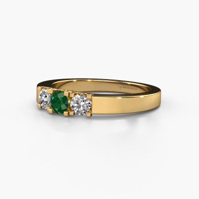 This extraordinary ring is called Selina 1. This type of ring is known as a memoire ring, because its gemstones are set in a continuous line. This makes it easy to combine with other rings. The band of this 14 Carat gold ring is set in a combination of emerald and diamond 3.7 mm. You can easily choose the combination you prefer online. As you can see, a single emerald is set in this single alliance gold ring. The memoire ring represents collaboration. And that is precisely what these gemstones do, collaborate. Together they add a beautiful effect to the band of a modern ring! Such a meaningful ring, wouldn't you agree? All our hand selected emerald are positioned by hand by our expert goldsmith. It's a precise task, which can only be completed successfully through the combination of pure craftsmanship and usage of the latest techniques which give it an optimal effect. To create a perfect reflection of light, all the gemstones have to be perfectly aligned in the same way. During manufacturing, the expert goldsmith will therefore monitor the reflection of light constantly to check whether the emerald are aligned properly. This requires a skilled hand and a lot of patience but then the end product will be a true piece of art. And that is our mission!By using our modern techniques, we can design and customize the finest quality jewels with the utmost care for you. Our rings are always priced 30 percent lower than other jewellers. We make rings to order, so we don't have to maintain a large stock. If you have a certain budget, we are more than happy to advice you accordingly.New jewellery designs are added to our online collection daily. Our team of passionate designers strive to create extraordinary and diverse designs. Have you seen a ring you like? Please feel free to contact us. Based on a good price/ quality ratio, we will make you an offer you can't refuse!To make it easier for you, we offer a 30 day return policy. Check our terms and conditions.
