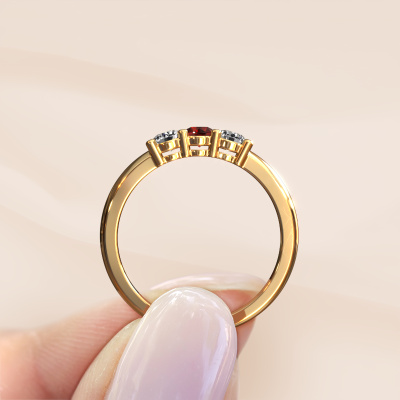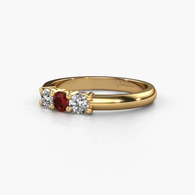 This extraordinary ring is called Michelle 3. This type of ring is known as a memoire ring, because its gemstones are set in a continuous line. This makes it easy to combine with other rings. The band of this 14 Carat gold ring is set in a combination of garnet and lab grown diamond 3.7 mm. You can easily choose the combination you prefer online. As you can see, a single garnet is set in this single alliance gold ring. The memoire ring represents collaboration. And that is precisely what these gemstones do, collaborate. Together they add a beautiful effect to the band of a classic ring! Such a meaningful ring, wouldn't you agree? All our hand selected garnet are positioned by hand by our expert goldsmith. It's a precise task, which can only be completed successfully through the combination of pure craftsmanship and usage of the latest techniques which give it an optimal effect. To create a perfect reflection of light, all the gemstones have to be perfectly aligned in the same way. During manufacturing, the expert goldsmith will therefore monitor the reflection of light constantly to check whether the garnet are aligned properly. This requires a skilled hand and a lot of patience but then the end product will be a true piece of art. And that is our mission!Are you on a budget? Please feel free to contact us, so we can go discuss your options. We offer our rings at guaranteed best price, because we make them to order. You won't find such a price anywhere else!
