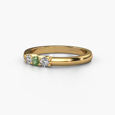 This extraordinary ring is called Yasmin 3. This type of ring is known as a memoire ring, because its gemstones are set in a continuous line. This makes it easy to combine with other rings. The band of this 14 Carat gold ring is set in a combination of tourmaline green and lab grown diamond 3 mm. You can easily choose the combination you prefer online. As you can see, a single tourmaline green is set in this single alliance gold ring. The memoire ring represents collaboration. And that is precisely what these gemstones do, collaborate. Together they add a beautiful effect to the band of a classic ring! Such a meaningful ring, wouldn't you agree? All our hand selected tourmaline green are positioned by hand by our expert goldsmith. It's a precise task, which can only be completed successfully through the combination of pure craftsmanship and usage of the latest techniques which give it an optimal effect. To create a perfect reflection of light, all the gemstones have to be perfectly aligned in the same way. During manufacturing, the expert goldsmith will therefore monitor the reflection of light constantly to check whether the tourmaline green are aligned properly. This requires a skilled hand and a lot of patience but then the end product will be a true piece of art. And that is our mission!By using a combination of the latest modern techniques, combined with ancient crafting, we can make all our rings in our own studio. Each jewel is made to order. This is advantageous because we can offer you a price you won't find anywhere else.Our talented designers add new designs to our online collection daily. Together they create a diverse collection of the finest jewellery. If you prefer to make a ring according your own design, please feel free to request a quote. We will make you an amazing offer, based on quality and price.To make it easier for you, we offer a 30 day return policy. Check our terms and conditions.
