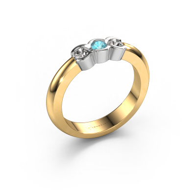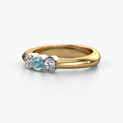 This extraordinary ring is called Lotte 3. This type of ring is known as a memoire ring, because its gemstones are set in a continuous line. This makes it easy to combine with other rings. The band of this 14 Carat gold ring is set in a combination of blue topaz and diamond 3 mm. You can easily choose the combination you prefer online. As you can see, a single blue topaz is set in this single alliance gold ring. The memoire ring represents collaboration. And that is precisely what these gemstones do, collaborate. Together they add a beautiful effect to the band of a modern ring! Such a meaningful ring, wouldn't you agree? All our hand selected blue topaz are positioned by hand by our expert goldsmith. It's a precise task, which can only be completed successfully through the combination of pure craftsmanship and usage of the latest techniques which give it an optimal effect. To create a perfect reflection of light, all the gemstones have to be perfectly aligned in the same way. During manufacturing, the expert goldsmith will therefore monitor the reflection of light constantly to check whether the blue topaz are aligned properly. This requires a skilled hand and a lot of patience but then the end product will be a true piece of art. And that is our mission!By using a combination of the latest modern techniques, combined with ancient crafting, we can make all our rings in our own studio. Each jewel is made to order. This is advantageous because we can offer you a price you won't find anywhere else.Our team of talented, passionate designers add new ring designs to our online collection daily. Our objective in doing so, is to be able to offer you a wide variety of jewels. Please feel free to request a quote if you have specific wishes for your ring. We guarantee to make you an offer you can't refuse.To make it easier for you, we offer a 30 day return policy. Check our terms and conditions.