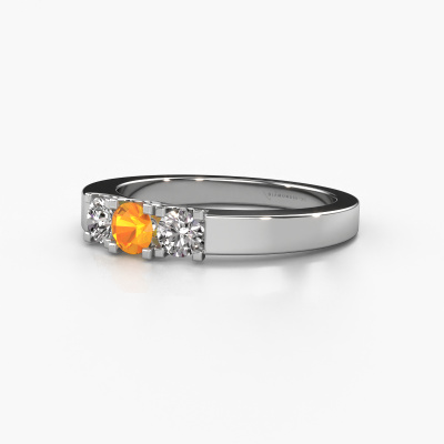 This extraordinary ring is called Selina 1. This type of ring is known as a memoire ring, because its gemstones are set in a continuous line. This makes it easy to combine with other rings. The band of this platinum ring is set in a combination of citrin and diamond 3.7 mm. You can easily choose the combination you prefer online. As you can see, a single citrin is set in this single alliance platinum ring. The memoire ring represents collaboration. And that is precisely what these gemstones do, collaborate. Together they add a beautiful effect to the band of a modern ring! Such a meaningful ring, wouldn't you agree? All our hand selected citrin are positioned by hand by our expert goldsmith. It's a precise task, which can only be completed successfully through the combination of pure craftsmanship and usage of the latest techniques which give it an optimal effect. To create a perfect reflection of light, all the gemstones have to be perfectly aligned in the same way. During manufacturing, the expert goldsmith will therefore monitor the reflection of light constantly to check whether the citrin are aligned properly. This requires a skilled hand and a lot of patience but then the end product will be a true piece of art. And that is our mission!By using our modern techniques, we can design and customize the finest quality jewels with the utmost care for you. Our rings are always priced 30 percent lower than other jewellers. We make rings to order, so we don't have to maintain a large stock. If you have a certain budget, we are more than happy to advice you accordingly.New jewellery designs are added to our online collection daily. Our team of passionate designers strive to create extraordinary and diverse designs. Have you seen a ring you like? Please feel free to contact us. Based on a good price/ quality ratio, we will make you an offer you can't refuse!To make it easier for you, we offer a 30 day return policy. Check our terms and conditions.