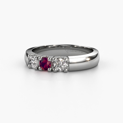 This extraordinary ring is called Rianne 3. This type of ring is known as a memoire ring, because its gemstones are set in a continuous line. This makes it easy to combine with other rings. The band of this platinum ring is set in a combination of rhodolite and diamond 3.4 mm. You can easily choose the combination you prefer online. As you can see, a single rhodolite is set in this single alliance platinum ring. The memoire ring represents collaboration. And that is precisely what these gemstones do, collaborate. Together they add a beautiful effect to the band of a classic ring! Such a meaningful ring, wouldn't you agree? All our hand selected rhodolite are positioned by hand by our expert goldsmith. It's a precise task, which can only be completed successfully through the combination of pure craftsmanship and usage of the latest techniques which give it an optimal effect. To create a perfect reflection of light, all the gemstones have to be perfectly aligned in the same way. During manufacturing, the expert goldsmith will therefore monitor the reflection of light constantly to check whether the rhodolite are aligned properly. This requires a skilled hand and a lot of patience but then the end product will be a true piece of art. And that is our mission!After receiving your order, our goldsmiths will passionately start the creative process of making your ring in our own studio. Because we don't have a big stockpile, these costs will not be passed on to you. Our pricing is proof of that! We offer top quality jewels at lowest price, guaranteed.Our team of talented, passionate designers add new ring designs to our online collection daily. Our objective in doing so, is to be able to offer you a wide variety of jewels. Please feel free to request a quote if you have specific wishes for your ring. We guarantee to make you an offer you can't refuse.To make it easier for you, we offer a 30 day return policy. Check our terms and conditions.