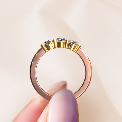 This extraordinary ring is called Yasmin 3. This type of ring is known as a memoire ring, because its gemstones are set in a continuous line. This makes it easy to combine with other rings. The band of this 14 Carat rose gold ring is set in a combination of diamond and lab grown diamond 0.900 crt. You can easily choose the combination you prefer online. As you can see, a single diamond is set in this single alliance rose gold ring. The memoire ring represents collaboration. And that is precisely what these gemstones do, collaborate. Together they add a beautiful effect to the band of a classic ring! Such a meaningful ring, wouldn't you agree? All our hand selected diamonds are positioned by hand by our expert goldsmith. It's a precise task, which can only be completed successfully through the combination of pure craftsmanship and usage of the latest techniques which give it an optimal effect. To create a perfect reflection of light, all the gemstones have to be perfectly aligned in the same way. During manufacturing, the expert goldsmith will therefore monitor the reflection of light constantly to check whether the diamonds are aligned properly. This requires a skilled hand and a lot of patience but then the end product will be a true piece of art. And that is our mission!By using a combination of the latest modern techniques, combined with ancient crafting, we can make all our rings in our own studio. Each jewel is made to order. This is advantageous because we can offer you a price you won't find anywhere else.Our talented designers add new designs to our online collection daily. Together they create a diverse collection of the finest jewellery. If you prefer to make a ring according your own design, please feel free to request a quote. We will make you an amazing offer, based on quality and price.To make it easier for you, we offer a 30 day return policy. Check our terms and conditions.
