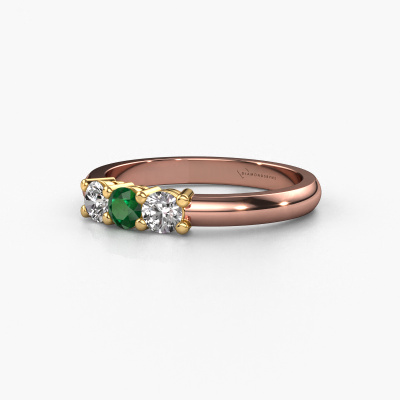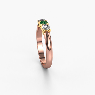 This extraordinary ring is called Michelle 3. This type of ring is known as a memoire ring, because its gemstones are set in a continuous line. This makes it easy to combine with other rings. The band of this 14 Carat rose gold ring is set in a combination of emerald and lab grown diamond 3.7 mm. You can easily choose the combination you prefer online. As you can see, a single emerald is set in this single alliance rose gold ring. The memoire ring represents collaboration. And that is precisely what these gemstones do, collaborate. Together they add a beautiful effect to the band of a classic ring! Such a meaningful ring, wouldn't you agree? All our hand selected emerald are positioned by hand by our expert goldsmith. It's a precise task, which can only be completed successfully through the combination of pure craftsmanship and usage of the latest techniques which give it an optimal effect. To create a perfect reflection of light, all the gemstones have to be perfectly aligned in the same way. During manufacturing, the expert goldsmith will therefore monitor the reflection of light constantly to check whether the emerald are aligned properly. This requires a skilled hand and a lot of patience but then the end product will be a true piece of art. And that is our mission!Are you on a budget? Please feel free to contact us, so we can go discuss your options. We offer our rings at guaranteed best price, because we make them to order. You won't find such a price anywhere else!