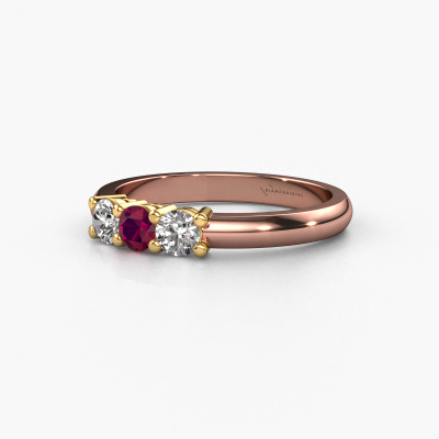 This extraordinary ring is called Michelle 3. This type of ring is known as a memoire ring, because its gemstones are set in a continuous line. This makes it easy to combine with other rings. The band of this 14 Carat rose gold ring is set in a combination of rhodolite and lab grown diamond 3.7 mm. You can easily choose the combination you prefer online. As you can see, a single rhodolite is set in this single alliance rose gold ring. The memoire ring represents collaboration. And that is precisely what these gemstones do, collaborate. Together they add a beautiful effect to the band of a classic ring! Such a meaningful ring, wouldn't you agree? All our hand selected rhodolite are positioned by hand by our expert goldsmith. It's a precise task, which can only be completed successfully through the combination of pure craftsmanship and usage of the latest techniques which give it an optimal effect. To create a perfect reflection of light, all the gemstones have to be perfectly aligned in the same way. During manufacturing, the expert goldsmith will therefore monitor the reflection of light constantly to check whether the rhodolite are aligned properly. This requires a skilled hand and a lot of patience but then the end product will be a true piece of art. And that is our mission!Are you on a budget? Please feel free to contact us, so we can go discuss your options. We offer our rings at guaranteed best price, because we make them to order. You won't find such a price anywhere else!