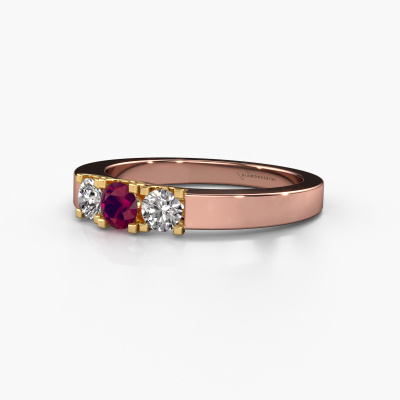 This extraordinary ring is called Selina 1. This type of ring is known as a memoire ring, because its gemstones are set in a continuous line. This makes it easy to combine with other rings. The band of this 14 Carat rose gold ring is set in a combination of rhodolite and diamond 3.7 mm. You can easily choose the combination you prefer online. As you can see, a single rhodolite is set in this single alliance rose gold ring. The memoire ring represents collaboration. And that is precisely what these gemstones do, collaborate. Together they add a beautiful effect to the band of a modern ring! Such a meaningful ring, wouldn't you agree? All our hand selected rhodolite are positioned by hand by our expert goldsmith. It's a precise task, which can only be completed successfully through the combination of pure craftsmanship and usage of the latest techniques which give it an optimal effect. To create a perfect reflection of light, all the gemstones have to be perfectly aligned in the same way. During manufacturing, the expert goldsmith will therefore monitor the reflection of light constantly to check whether the rhodolite are aligned properly. This requires a skilled hand and a lot of patience but then the end product will be a true piece of art. And that is our mission!By using our modern techniques, we can design and customize the finest quality jewels with the utmost care for you. Our rings are always priced 30 percent lower than other jewellers. We make rings to order, so we don't have to maintain a large stock. If you have a certain budget, we are more than happy to advice you accordingly.New jewellery designs are added to our online collection daily. Our team of passionate designers strive to create extraordinary and diverse designs. Have you seen a ring you like? Please feel free to contact us. Based on a good price/ quality ratio, we will make you an offer you can't refuse!To make it easier for you, we offer a 30 day return policy. Check our terms and conditions.