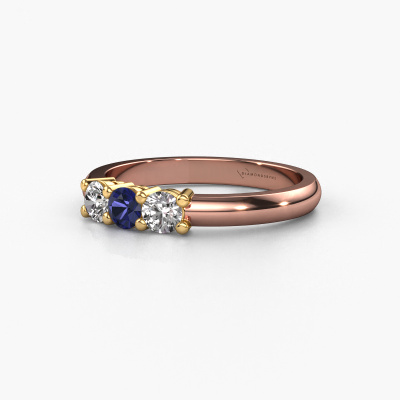 This extraordinary ring is called Michelle 3. This type of ring is known as a memoire ring, because its gemstones are set in a continuous line. This makes it easy to combine with other rings. The band of this 14 Carat rose gold ring is set in a combination of sapphire and lab grown diamond 3.7 mm. You can easily choose the combination you prefer online. As you can see, a single sapphire is set in this single alliance rose gold ring. The memoire ring represents collaboration. And that is precisely what these gemstones do, collaborate. Together they add a beautiful effect to the band of a classic ring! Such a meaningful ring, wouldn't you agree? All our hand selected sapphire are positioned by hand by our expert goldsmith. It's a precise task, which can only be completed successfully through the combination of pure craftsmanship and usage of the latest techniques which give it an optimal effect. To create a perfect reflection of light, all the gemstones have to be perfectly aligned in the same way. During manufacturing, the expert goldsmith will therefore monitor the reflection of light constantly to check whether the sapphire are aligned properly. This requires a skilled hand and a lot of patience but then the end product will be a true piece of art. And that is our mission!Are you on a budget? Please feel free to contact us, so we can go discuss your options. We offer our rings at guaranteed best price, because we make them to order. You won't find such a price anywhere else!
