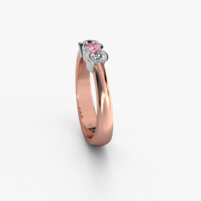 This extraordinary ring is called Lotte 3. This type of ring is known as a memoire ring, because its gemstones are set in a continuous line. This makes it easy to combine with other rings. The band of this 14 Carat rose gold ring is set in a combination of pink sapphire and diamond 3 mm. You can easily choose the combination you prefer online. As you can see, a single pink sapphire is set in this single alliance rose gold ring. The memoire ring represents collaboration. And that is precisely what these gemstones do, collaborate. Together they add a beautiful effect to the band of a modern ring! Such a meaningful ring, wouldn't you agree? All our hand selected pink sapphire are positioned by hand by our expert goldsmith. It's a precise task, which can only be completed successfully through the combination of pure craftsmanship and usage of the latest techniques which give it an optimal effect. To create a perfect reflection of light, all the gemstones have to be perfectly aligned in the same way. During manufacturing, the expert goldsmith will therefore monitor the reflection of light constantly to check whether the pink sapphire are aligned properly. This requires a skilled hand and a lot of patience but then the end product will be a true piece of art. And that is our mission!By using a combination of the latest modern techniques, combined with ancient crafting, we can make all our rings in our own studio. Each jewel is made to order. This is advantageous because we can offer you a price you won't find anywhere else.Our team of talented, passionate designers add new ring designs to our online collection daily. Our objective in doing so, is to be able to offer you a wide variety of jewels. Please feel free to request a quote if you have specific wishes for your ring. We guarantee to make you an offer you can't refuse.To make it easier for you, we offer a 30 day return policy. Check our terms and conditions.