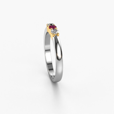 This extraordinary ring is called Yasmin 3. This type of ring is known as a memoire ring, because its gemstones are set in a continuous line. This makes it easy to combine with other rings. The band of this 14 Carat white gold ring is set in a combination of rhodolite and lab grown diamond 3 mm. You can easily choose the combination you prefer online. As you can see, a single rhodolite is set in this single alliance white gold ring. The memoire ring represents collaboration. And that is precisely what these gemstones do, collaborate. Together they add a beautiful effect to the band of a classic ring! Such a meaningful ring, wouldn't you agree? All our hand selected rhodolite are positioned by hand by our expert goldsmith. It's a precise task, which can only be completed successfully through the combination of pure craftsmanship and usage of the latest techniques which give it an optimal effect. To create a perfect reflection of light, all the gemstones have to be perfectly aligned in the same way. During manufacturing, the expert goldsmith will therefore monitor the reflection of light constantly to check whether the rhodolite are aligned properly. This requires a skilled hand and a lot of patience but then the end product will be a true piece of art. And that is our mission!By using a combination of the latest modern techniques, combined with ancient crafting, we can make all our rings in our own studio. Each jewel is made to order. This is advantageous because we can offer you a price you won't find anywhere else.Our talented designers add new designs to our online collection daily. Together they create a diverse collection of the finest jewellery. If you prefer to make a ring according your own design, please feel free to request a quote. We will make you an amazing offer, based on quality and price.To make it easier for you, we offer a 30 day return policy. Check our terms and conditions.