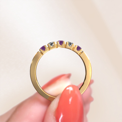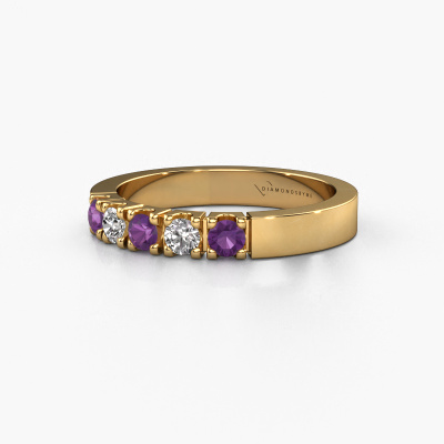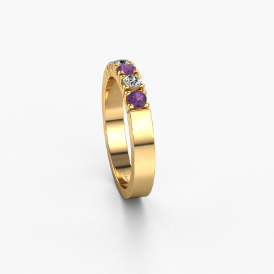 This extraordinary ring is called Dana 5. This type of ring is known as a memoire ring, because its gemstones are set in a continuous line. This makes it easy to combine with other rings. The band of this 14 Carat gold ring is set in a combination of amethyst and diamond 3 mm. You can easily choose the combination you prefer online. As you can see, a single amethyst is set in this single alliance gold ring. The memoire ring represents collaboration. And that is precisely what these gemstones do, collaborate. Together they add a beautiful effect to the band of a modern ring! Such a meaningful ring, wouldn't you agree? All our hand selected amethysten are positioned by hand by our expert goldsmith. It's a precise task, which can only be completed successfully through the combination of pure craftsmanship and usage of the latest techniques which give it an optimal effect. To create a perfect reflection of light, all the gemstones have to be perfectly aligned in the same way. During manufacturing, the expert goldsmith will therefore monitor the reflection of light constantly to check whether the amethysten are aligned properly. This requires a skilled hand and a lot of patience but then the end product will be a true piece of art. And that is our mission!Because we design and deliver our own rings, we can offer you a ring at a price you won't find anywhere else. A ring is made to order, which helps prevent excess supplies, so we can make you a great price offer. We understand it feels risky, buying your ring online, but we will gladly assist in the designing process, taking your budget into consideration.New jewellery designs are added to our online collection daily. Our team of passionate designers strive to create extraordinary and diverse designs. Have you seen a ring you like? Please feel free to contact us. Based on a good price/ quality ratio, we will make you an offer you can't refuse!To make it easier for you, we offer a 30 day return policy. Check our terms and conditions.