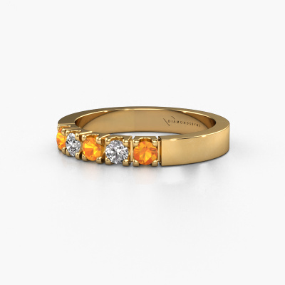 This extraordinary ring is called Dana 5. This type of ring is known as a memoire ring, because its gemstones are set in a continuous line. This makes it easy to combine with other rings. The band of this 14 Carat gold ring is set in a combination of citrin and diamond 3 mm. You can easily choose the combination you prefer online. As you can see, a single citrin is set in this single alliance gold ring. The memoire ring represents collaboration. And that is precisely what these gemstones do, collaborate. Together they add a beautiful effect to the band of a modern ring! Such a meaningful ring, wouldn't you agree? All our hand selected citrin are positioned by hand by our expert goldsmith. It's a precise task, which can only be completed successfully through the combination of pure craftsmanship and usage of the latest techniques which give it an optimal effect. To create a perfect reflection of light, all the gemstones have to be perfectly aligned in the same way. During manufacturing, the expert goldsmith will therefore monitor the reflection of light constantly to check whether the citrin are aligned properly. This requires a skilled hand and a lot of patience but then the end product will be a true piece of art. And that is our mission!Because we design and deliver our own rings, we can offer you a ring at a price you won't find anywhere else. A ring is made to order, which helps prevent excess supplies, so we can make you a great price offer. We understand it feels risky, buying your ring online, but we will gladly assist in the designing process, taking your budget into consideration.New jewellery designs are added to our online collection daily. Our team of passionate designers strive to create extraordinary and diverse designs. Have you seen a ring you like? Please feel free to contact us. Based on a good price/ quality ratio, we will make you an offer you can't refuse!To make it easier for you, we offer a 30 day return policy. Check our terms and conditions.