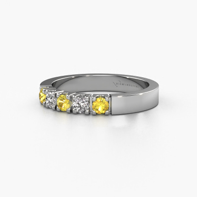 This extraordinary ring is called Dana 5. This type of ring is known as a memoire ring, because its gemstones are set in a continuous line. This makes it easy to combine with other rings. The band of this platinum ring is set in a combination of yellow sapphire and diamond 3 mm. You can easily choose the combination you prefer online. As you can see, a single yellow sapphire is set in this single alliance platinum ring. The memoire ring represents collaboration. And that is precisely what these gemstones do, collaborate. Together they add a beautiful effect to the band of a modern ring! Such a meaningful ring, wouldn't you agree? All our hand selected yellow sapphire are positioned by hand by our expert goldsmith. It's a precise task, which can only be completed successfully through the combination of pure craftsmanship and usage of the latest techniques which give it an optimal effect. To create a perfect reflection of light, all the gemstones have to be perfectly aligned in the same way. During manufacturing, the expert goldsmith will therefore monitor the reflection of light constantly to check whether the yellow sapphire are aligned properly. This requires a skilled hand and a lot of patience but then the end product will be a true piece of art. And that is our mission!Because we design and deliver our own rings, we can offer you a ring at a price you won't find anywhere else. A ring is made to order, which helps prevent excess supplies, so we can make you a great price offer. We understand it feels risky, buying your ring online, but we will gladly assist in the designing process, taking your budget into consideration.New jewellery designs are added to our online collection daily. Our team of passionate designers strive to create extraordinary and diverse designs. Have you seen a ring you like? Please feel free to contact us. Based on a good price/ quality ratio, we will make you an offer you can't refuse!To make it easier for you, we offer a 30 day return policy. Check our terms and conditions.