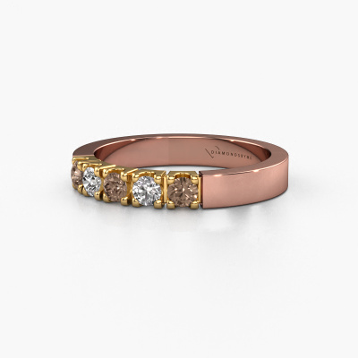 This extraordinary ring is called Dana 5. This type of ring is known as a memoire ring, because its gemstones are set in a continuous line. This makes it easy to combine with other rings. The band of this 14 Carat rose gold ring is set in a combination of brown diamond and diamond 0.50 crt. You can easily choose the combination you prefer online. As you can see, a single brown diamond is set in this single alliance rose gold ring. The memoire ring represents collaboration. And that is precisely what these gemstones do, collaborate. Together they add a beautiful effect to the band of a modern ring! Such a meaningful ring, wouldn't you agree? All our hand selected brown diamonds are positioned by hand by our expert goldsmith. It's a precise task, which can only be completed successfully through the combination of pure craftsmanship and usage of the latest techniques which give it an optimal effect. To create a perfect reflection of light, all the gemstones have to be perfectly aligned in the same way. During manufacturing, the expert goldsmith will therefore monitor the reflection of light constantly to check whether the brown diamonds are aligned properly. This requires a skilled hand and a lot of patience but then the end product will be a true piece of art. And that is our mission!Because we design and deliver our own rings, we can offer you a ring at a price you won't find anywhere else. A ring is made to order, which helps prevent excess supplies, so we can make you a great price offer. We understand it feels risky, buying your ring online, but we will gladly assist in the designing process, taking your budget into consideration.New jewellery designs are added to our online collection daily. Our team of passionate designers strive to create extraordinary and diverse designs. Have you seen a ring you like? Please feel free to contact us. Based on a good price/ quality ratio, we will make you an offer you can't refuse!To make it easier for you, we offer a 30 day return policy. Check our terms and conditions.