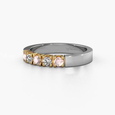 This extraordinary ring is called Dana 5. This type of ring is known as a memoire ring, because its gemstones are set in a continuous line. This makes it easy to combine with other rings. The band of this 14 Carat white gold ring is set in a combination of morganite champagne and diamond 3 mm. You can easily choose the combination you prefer online. As you can see, a single morganite champagne is set in this single alliance white gold ring. The memoire ring represents collaboration. And that is precisely what these gemstones do, collaborate. Together they add a beautiful effect to the band of a modern ring! Such a meaningful ring, wouldn't you agree? All our hand selected morganite champagne are positioned by hand by our expert goldsmith. It's a precise task, which can only be completed successfully through the combination of pure craftsmanship and usage of the latest techniques which give it an optimal effect. To create a perfect reflection of light, all the gemstones have to be perfectly aligned in the same way. During manufacturing, the expert goldsmith will therefore monitor the reflection of light constantly to check whether the morganite champagne are aligned properly. This requires a skilled hand and a lot of patience but then the end product will be a true piece of art. And that is our mission!