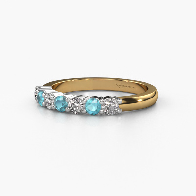 This extraordinary ring is called Yasmin 7. This type of ring is known as a memoire ring, because its gemstones are set in a continuous line. This makes it easy to combine with other rings. The band of this 14 Carat gold ring is set in a combination of blue topaz and lab grown diamond 2.7 mm. You can easily choose the combination you prefer online. As you can see, a single blue topaz is set in this single alliance gold ring. The memoire ring represents collaboration. And that is precisely what these gemstones do, collaborate. Together they add a beautiful effect to the band of a classic ring! Such a meaningful ring, wouldn't you agree? All our hand selected blue topaz are positioned by hand by our expert goldsmith. It's a precise task, which can only be completed successfully through the combination of pure craftsmanship and usage of the latest techniques which give it an optimal effect. To create a perfect reflection of light, all the gemstones have to be perfectly aligned in the same way. During manufacturing, the expert goldsmith will therefore monitor the reflection of light constantly to check whether the blue topaz are aligned properly. This requires a skilled hand and a lot of patience but then the end product will be a true piece of art. And that is our mission!After receiving your order, our goldsmiths will passionately start the creative process of making your ring in our own studio. Because we don't have a big stockpile, these costs will not be passed on to you. Our pricing is proof of that! We offer top quality jewels at lowest price, guaranteed.Our team of talented, passionate designers add new ring designs to our online collection daily. Our objective in doing so, is to be able to offer you a wide variety of jewels. Please feel free to request a quote if you have specific wishes for your ring. We guarantee to make you an offer you can't refuse.To make it easier for you, we offer a 30 day return policy. Check our terms and conditions.