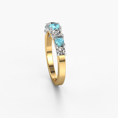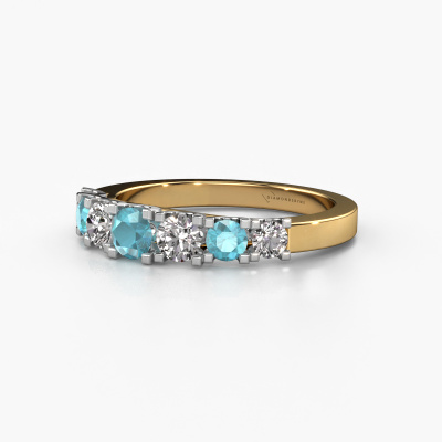 This extraordinary ring is called Selina 3. This type of ring is known as a memoire ring, because its gemstones are set in a continuous line. This makes it easy to combine with other rings. The band of this 14 Carat gold ring is set in a combination of blue topaz and diamond 3.7 mm. You can easily choose the combination you prefer online. As you can see, a single blue topaz is set in this single alliance gold ring. The memoire ring represents collaboration. And that is precisely what these gemstones do, collaborate. Together they add a beautiful effect to the band of a modern ring! Such a meaningful ring, wouldn't you agree? All our hand selected blue topaz are positioned by hand by our expert goldsmith. It's a precise task, which can only be completed successfully through the combination of pure craftsmanship and usage of the latest techniques which give it an optimal effect. To create a perfect reflection of light, all the gemstones have to be perfectly aligned in the same way. During manufacturing, the expert goldsmith will therefore monitor the reflection of light constantly to check whether the blue topaz are aligned properly. This requires a skilled hand and a lot of patience but then the end product will be a true piece of art. And that is our mission!Because we design and deliver our own rings, we can offer you a ring at a price you won't find anywhere else. A ring is made to order, which helps prevent excess supplies, so we can make you a great price offer. We understand it feels risky, buying your ring online, but we will gladly assist in the designing process, taking your budget into consideration.Our team of talented, passionate designers add new ring designs to our online collection daily. Our objective in doing so, is to be able to offer you a wide variety of jewels. Please feel free to request a quote if you have specific wishes for your ring. We guarantee to make you an offer you can't refuse.To make it easier for you, we offer a 30 day return policy. Check our terms and conditions.