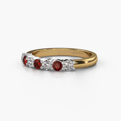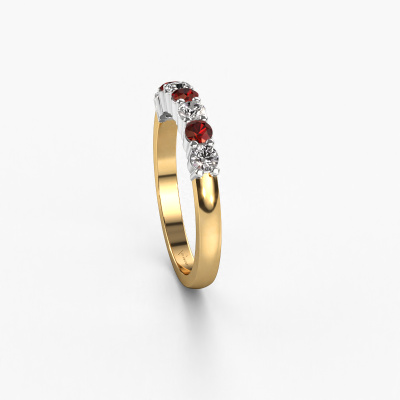 This extraordinary ring is called Yasmin 7. This type of ring is known as a memoire ring, because its gemstones are set in a continuous line. This makes it easy to combine with other rings. The band of this 14 Carat gold ring is set in a combination of garnet and lab grown diamond 2.7 mm. You can easily choose the combination you prefer online. As you can see, a single garnet is set in this single alliance gold ring. The memoire ring represents collaboration. And that is precisely what these gemstones do, collaborate. Together they add a beautiful effect to the band of a classic ring! Such a meaningful ring, wouldn't you agree? All our hand selected garnet are positioned by hand by our expert goldsmith. It's a precise task, which can only be completed successfully through the combination of pure craftsmanship and usage of the latest techniques which give it an optimal effect. To create a perfect reflection of light, all the gemstones have to be perfectly aligned in the same way. During manufacturing, the expert goldsmith will therefore monitor the reflection of light constantly to check whether the garnet are aligned properly. This requires a skilled hand and a lot of patience but then the end product will be a true piece of art. And that is our mission!After receiving your order, our goldsmiths will passionately start the creative process of making your ring in our own studio. Because we don't have a big stockpile, these costs will not be passed on to you. Our pricing is proof of that! We offer top quality jewels at lowest price, guaranteed.Our team of talented, passionate designers add new ring designs to our online collection daily. Our objective in doing so, is to be able to offer you a wide variety of jewels. Please feel free to request a quote if you have specific wishes for your ring. We guarantee to make you an offer you can't refuse.To make it easier for you, we offer a 30 day return policy. Check our terms and conditions.
