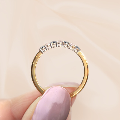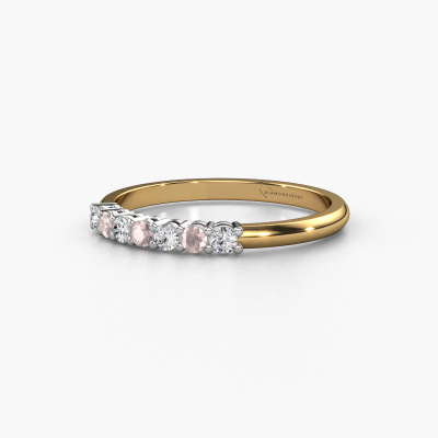 This extraordinary ring is called Michelle 7. This type of ring is known as a memoire ring, because its gemstones are set in a continuous line. This makes it easy to combine with other rings. The band of this 14 Carat gold ring is set in a combination of morganite champagne and diamond 2 mm. You can easily choose the combination you prefer online. As you can see, a single morganite champagne is set in this single alliance gold ring. The memoire ring represents collaboration. And that is precisely what these gemstones do, collaborate. Together they add a beautiful effect to the band of a classic ring! Such a meaningful ring, wouldn't you agree? All our hand selected morganite champagne are positioned by hand by our expert goldsmith. It's a precise task, which can only be completed successfully through the combination of pure craftsmanship and usage of the latest techniques which give it an optimal effect. To create a perfect reflection of light, all the gemstones have to be perfectly aligned in the same way. During manufacturing, the expert goldsmith will therefore monitor the reflection of light constantly to check whether the morganite champagne are aligned properly. This requires a skilled hand and a lot of patience but then the end product will be a true piece of art. And that is our mission!