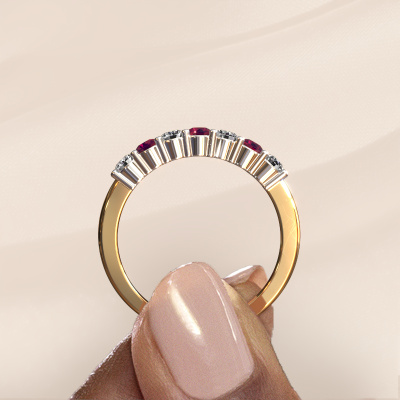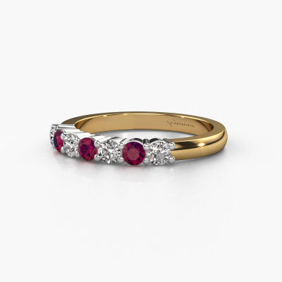 This extraordinary ring is called Yasmin 7. This type of ring is known as a memoire ring, because its gemstones are set in a continuous line. This makes it easy to combine with other rings. The band of this 14 Carat gold ring is set in a combination of rhodolite and lab grown diamond 2.7 mm. You can easily choose the combination you prefer online. As you can see, a single rhodolite is set in this single alliance gold ring. The memoire ring represents collaboration. And that is precisely what these gemstones do, collaborate. Together they add a beautiful effect to the band of a classic ring! Such a meaningful ring, wouldn't you agree? All our hand selected rhodolite are positioned by hand by our expert goldsmith. It's a precise task, which can only be completed successfully through the combination of pure craftsmanship and usage of the latest techniques which give it an optimal effect. To create a perfect reflection of light, all the gemstones have to be perfectly aligned in the same way. During manufacturing, the expert goldsmith will therefore monitor the reflection of light constantly to check whether the rhodolite are aligned properly. This requires a skilled hand and a lot of patience but then the end product will be a true piece of art. And that is our mission!After receiving your order, our goldsmiths will passionately start the creative process of making your ring in our own studio. Because we don't have a big stockpile, these costs will not be passed on to you. Our pricing is proof of that! We offer top quality jewels at lowest price, guaranteed.Our team of talented, passionate designers add new ring designs to our online collection daily. Our objective in doing so, is to be able to offer you a wide variety of jewels. Please feel free to request a quote if you have specific wishes for your ring. We guarantee to make you an offer you can't refuse.To make it easier for you, we offer a 30 day return policy. Check our terms and conditions.