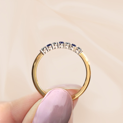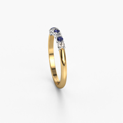 This extraordinary ring is called Michelle 7. This type of ring is known as a memoire ring, because its gemstones are set in a continuous line. This makes it easy to combine with other rings. The band of this 14 Carat gold ring is set in a combination of sapphire and diamond 2 mm. You can easily choose the combination you prefer online. As you can see, a single sapphire is set in this single alliance gold ring. The memoire ring represents collaboration. And that is precisely what these gemstones do, collaborate. Together they add a beautiful effect to the band of a classic ring! Such a meaningful ring, wouldn't you agree? All our hand selected sapphire are positioned by hand by our expert goldsmith. It's a precise task, which can only be completed successfully through the combination of pure craftsmanship and usage of the latest techniques which give it an optimal effect. To create a perfect reflection of light, all the gemstones have to be perfectly aligned in the same way. During manufacturing, the expert goldsmith will therefore monitor the reflection of light constantly to check whether the sapphire are aligned properly. This requires a skilled hand and a lot of patience but then the end product will be a true piece of art. And that is our mission!After receiving your order, our goldsmiths will passionately start the creative process of making your ring in our own studio. Because we don't have a big stockpile, these costs will not be passed on to you. Our pricing is proof of that! We offer top quality jewels at lowest price, guaranteed.