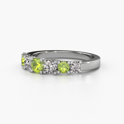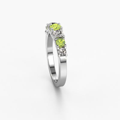 This extraordinary ring is called Selina 3. This type of ring is known as a memoire ring, because its gemstones are set in a continuous line. This makes it easy to combine with other rings. The band of this platinum ring is set in a combination of peridot and diamond 3.7 mm. You can easily choose the combination you prefer online. As you can see, a single peridot is set in this single alliance platinum ring. The memoire ring represents collaboration. And that is precisely what these gemstones do, collaborate. Together they add a beautiful effect to the band of a modern ring! Such a meaningful ring, wouldn't you agree? All our hand selected peridot are positioned by hand by our expert goldsmith. It's a precise task, which can only be completed successfully through the combination of pure craftsmanship and usage of the latest techniques which give it an optimal effect. To create a perfect reflection of light, all the gemstones have to be perfectly aligned in the same way. During manufacturing, the expert goldsmith will therefore monitor the reflection of light constantly to check whether the peridot are aligned properly. This requires a skilled hand and a lot of patience but then the end product will be a true piece of art. And that is our mission!Because we design and deliver our own rings, we can offer you a ring at a price you won't find anywhere else. A ring is made to order, which helps prevent excess supplies, so we can make you a great price offer. We understand it feels risky, buying your ring online, but we will gladly assist in the designing process, taking your budget into consideration.Our team of talented, passionate designers add new ring designs to our online collection daily. Our objective in doing so, is to be able to offer you a wide variety of jewels. Please feel free to request a quote if you have specific wishes for your ring. We guarantee to make you an offer you can't refuse.To make it easier for you, we offer a 30 day return policy. Check our terms and conditions.