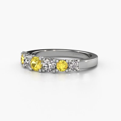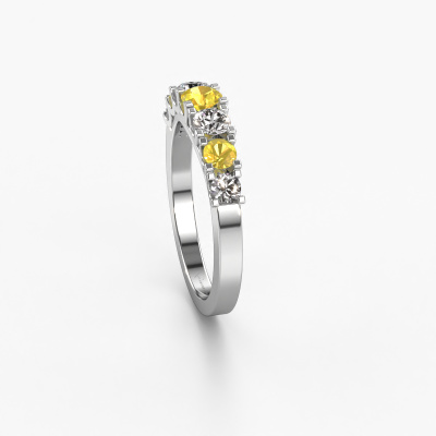 This extraordinary ring is called Selina 3. This type of ring is known as a memoire ring, because its gemstones are set in a continuous line. This makes it easy to combine with other rings. The band of this platinum ring is set in a combination of yellow sapphire and diamond 3.7 mm. You can easily choose the combination you prefer online. As you can see, a single yellow sapphire is set in this single alliance platinum ring. The memoire ring represents collaboration. And that is precisely what these gemstones do, collaborate. Together they add a beautiful effect to the band of a modern ring! Such a meaningful ring, wouldn't you agree? All our hand selected yellow sapphire are positioned by hand by our expert goldsmith. It's a precise task, which can only be completed successfully through the combination of pure craftsmanship and usage of the latest techniques which give it an optimal effect. To create a perfect reflection of light, all the gemstones have to be perfectly aligned in the same way. During manufacturing, the expert goldsmith will therefore monitor the reflection of light constantly to check whether the yellow sapphire are aligned properly. This requires a skilled hand and a lot of patience but then the end product will be a true piece of art. And that is our mission!Because we design and deliver our own rings, we can offer you a ring at a price you won't find anywhere else. A ring is made to order, which helps prevent excess supplies, so we can make you a great price offer. We understand it feels risky, buying your ring online, but we will gladly assist in the designing process, taking your budget into consideration.Our team of talented, passionate designers add new ring designs to our online collection daily. Our objective in doing so, is to be able to offer you a wide variety of jewels. Please feel free to request a quote if you have specific wishes for your ring. We guarantee to make you an offer you can't refuse.To make it easier for you, we offer a 30 day return policy. Check our terms and conditions.