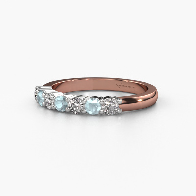 This extraordinary ring is called Yasmin 7. This type of ring is known as a memoire ring, because its gemstones are set in a continuous line. This makes it easy to combine with other rings. The band of this 14 Carat rose gold ring is set in a combination of aquamarine and lab grown diamond 2.7 mm. You can easily choose the combination you prefer online. As you can see, a single aquamarine is set in this single alliance rose gold ring. The memoire ring represents collaboration. And that is precisely what these gemstones do, collaborate. Together they add a beautiful effect to the band of a classic ring! Such a meaningful ring, wouldn't you agree? All our hand selected aquamarine are positioned by hand by our expert goldsmith. It's a precise task, which can only be completed successfully through the combination of pure craftsmanship and usage of the latest techniques which give it an optimal effect. To create a perfect reflection of light, all the gemstones have to be perfectly aligned in the same way. During manufacturing, the expert goldsmith will therefore monitor the reflection of light constantly to check whether the aquamarine are aligned properly. This requires a skilled hand and a lot of patience but then the end product will be a true piece of art. And that is our mission!After receiving your order, our goldsmiths will passionately start the creative process of making your ring in our own studio. Because we don't have a big stockpile, these costs will not be passed on to you. Our pricing is proof of that! We offer top quality jewels at lowest price, guaranteed.Our team of talented, passionate designers add new ring designs to our online collection daily. Our objective in doing so, is to be able to offer you a wide variety of jewels. Please feel free to request a quote if you have specific wishes for your ring. We guarantee to make you an offer you can't refuse.To make it easier for you, we offer a 30 day return policy. Check our terms and conditions.