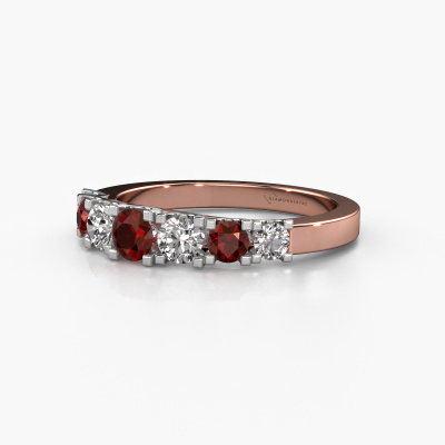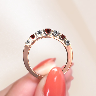 This extraordinary ring is called Selina 3. This type of ring is known as a memoire ring, because its gemstones are set in a continuous line. This makes it easy to combine with other rings. The band of this 14 Carat rose gold ring is set in a combination of garnet and diamond 3.7 mm. You can easily choose the combination you prefer online. As you can see, a single garnet is set in this single alliance rose gold ring. The memoire ring represents collaboration. And that is precisely what these gemstones do, collaborate. Together they add a beautiful effect to the band of a modern ring! Such a meaningful ring, wouldn't you agree? All our hand selected garnet are positioned by hand by our expert goldsmith. It's a precise task, which can only be completed successfully through the combination of pure craftsmanship and usage of the latest techniques which give it an optimal effect. To create a perfect reflection of light, all the gemstones have to be perfectly aligned in the same way. During manufacturing, the expert goldsmith will therefore monitor the reflection of light constantly to check whether the garnet are aligned properly. This requires a skilled hand and a lot of patience but then the end product will be a true piece of art. And that is our mission!Because we design and deliver our own rings, we can offer you a ring at a price you won't find anywhere else. A ring is made to order, which helps prevent excess supplies, so we can make you a great price offer. We understand it feels risky, buying your ring online, but we will gladly assist in the designing process, taking your budget into consideration.Our team of talented, passionate designers add new ring designs to our online collection daily. Our objective in doing so, is to be able to offer you a wide variety of jewels. Please feel free to request a quote if you have specific wishes for your ring. We guarantee to make you an offer you can't refuse.To make it easier for you, we offer a 30 day return policy. Check our terms and conditions.