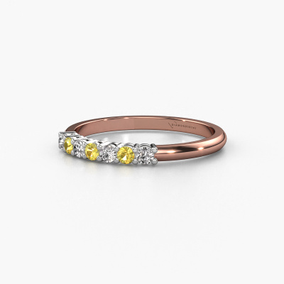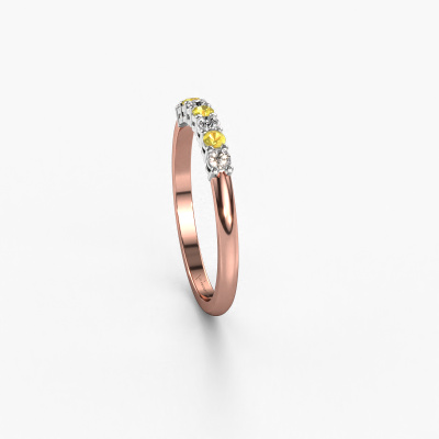 This extraordinary ring is called Michelle 7. This type of ring is known as a memoire ring, because its gemstones are set in a continuous line. This makes it easy to combine with other rings. The band of this 14 Carat rose gold ring is set in a combination of yellow sapphire and diamond 2 mm. You can easily choose the combination you prefer online. As you can see, a single yellow sapphire is set in this single alliance rose gold ring. The memoire ring represents collaboration. And that is precisely what these gemstones do, collaborate. Together they add a beautiful effect to the band of a classic ring! Such a meaningful ring, wouldn't you agree? All our hand selected yellow sapphire are positioned by hand by our expert goldsmith. It's a precise task, which can only be completed successfully through the combination of pure craftsmanship and usage of the latest techniques which give it an optimal effect. To create a perfect reflection of light, all the gemstones have to be perfectly aligned in the same way. During manufacturing, the expert goldsmith will therefore monitor the reflection of light constantly to check whether the yellow sapphire are aligned properly. This requires a skilled hand and a lot of patience but then the end product will be a true piece of art. And that is our mission!After receiving your order, our goldsmiths will passionately start the creative process of making your ring in our own studio. Because we don't have a big stockpile, these costs will not be passed on to you. Our pricing is proof of that! We offer top quality jewels at lowest price, guaranteed.