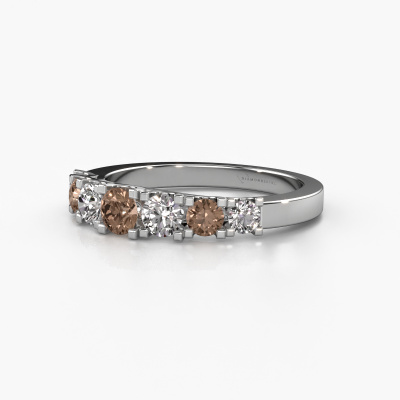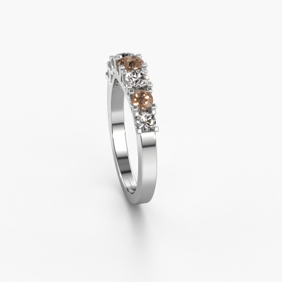 This extraordinary ring is called Selina 3. This type of ring is known as a memoire ring, because its gemstones are set in a continuous line. This makes it easy to combine with other rings. The band of this 14 Carat white gold ring is set in a combination of brown diamond and diamond 0.86 crt. You can easily choose the combination you prefer online. As you can see, a single brown diamond is set in this single alliance white gold ring. The memoire ring represents collaboration. And that is precisely what these gemstones do, collaborate. Together they add a beautiful effect to the band of a modern ring! Such a meaningful ring, wouldn't you agree? All our hand selected brown diamonds are positioned by hand by our expert goldsmith. It's a precise task, which can only be completed successfully through the combination of pure craftsmanship and usage of the latest techniques which give it an optimal effect. To create a perfect reflection of light, all the gemstones have to be perfectly aligned in the same way. During manufacturing, the expert goldsmith will therefore monitor the reflection of light constantly to check whether the brown diamonds are aligned properly. This requires a skilled hand and a lot of patience but then the end product will be a true piece of art. And that is our mission!Because we design and deliver our own rings, we can offer you a ring at a price you won't find anywhere else. A ring is made to order, which helps prevent excess supplies, so we can make you a great price offer. We understand it feels risky, buying your ring online, but we will gladly assist in the designing process, taking your budget into consideration.Our team of talented, passionate designers add new ring designs to our online collection daily. Our objective in doing so, is to be able to offer you a wide variety of jewels. Please feel free to request a quote if you have specific wishes for your ring. We guarantee to make you an offer you can't refuse.To make it easier for you, we offer a 30 day return policy. Check our terms and conditions.