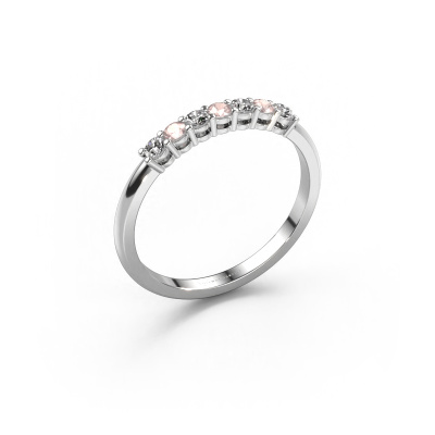 This extraordinary ring is called Michelle 7. This type of ring is known as a memoire ring, because its gemstones are set in a continuous line. This makes it easy to combine with other rings. The band of this 14 Carat white gold ring is set in a combination of morganite champagne and diamond 2 mm. You can easily choose the combination you prefer online. As you can see, a single morganite champagne is set in this single alliance white gold ring. The memoire ring represents collaboration. And that is precisely what these gemstones do, collaborate. Together they add a beautiful effect to the band of a classic ring! Such a meaningful ring, wouldn't you agree? All our hand selected morganite champagne are positioned by hand by our expert goldsmith. It's a precise task, which can only be completed successfully through the combination of pure craftsmanship and usage of the latest techniques which give it an optimal effect. To create a perfect reflection of light, all the gemstones have to be perfectly aligned in the same way. During manufacturing, the expert goldsmith will therefore monitor the reflection of light constantly to check whether the morganite champagne are aligned properly. This requires a skilled hand and a lot of patience but then the end product will be a true piece of art. And that is our mission!