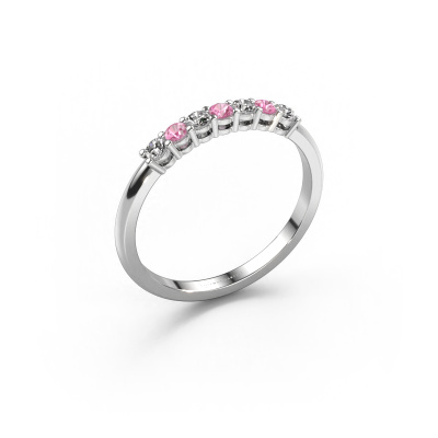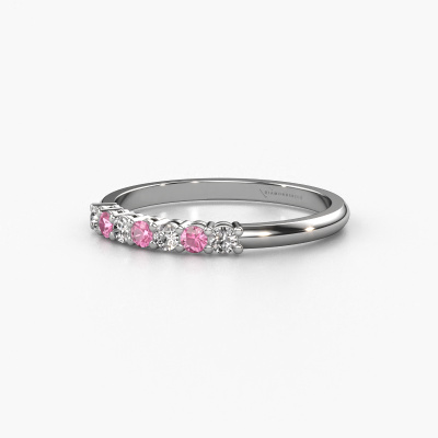 This extraordinary ring is called Michelle 7. This type of ring is known as a memoire ring, because its gemstones are set in a continuous line. This makes it easy to combine with other rings. The band of this 14 Carat white gold ring is set in a combination of pink sapphire and diamond 2 mm. You can easily choose the combination you prefer online. As you can see, a single pink sapphire is set in this single alliance white gold ring. The memoire ring represents collaboration. And that is precisely what these gemstones do, collaborate. Together they add a beautiful effect to the band of a classic ring! Such a meaningful ring, wouldn't you agree? All our hand selected pink sapphire are positioned by hand by our expert goldsmith. It's a precise task, which can only be completed successfully through the combination of pure craftsmanship and usage of the latest techniques which give it an optimal effect. To create a perfect reflection of light, all the gemstones have to be perfectly aligned in the same way. During manufacturing, the expert goldsmith will therefore monitor the reflection of light constantly to check whether the pink sapphire are aligned properly. This requires a skilled hand and a lot of patience but then the end product will be a true piece of art. And that is our mission!After receiving your order, our goldsmiths will passionately start the creative process of making your ring in our own studio. Because we don't have a big stockpile, these costs will not be passed on to you. Our pricing is proof of that! We offer top quality jewels at lowest price, guaranteed.