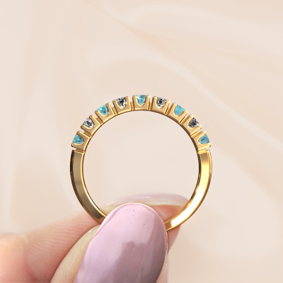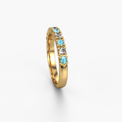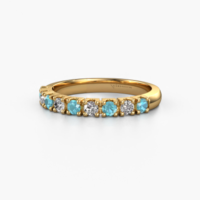 This extraordinary ring is called Rianne 9. This type of ring is known as a memoire ring, because its gemstones are set in a continuous line. This makes it easy to combine with other rings. The band of this 14 Carat gold ring is set in a combination of blue topaz and diamond 2.4 mm. You can easily choose the combination you prefer online. As you can see, a single blue topaz is set in this single alliance gold ring. The memoire ring represents collaboration. And that is precisely what these gemstones do, collaborate. Together they add a beautiful effect to the band of a classic ring! Such a meaningful ring, wouldn't you agree? All our hand selected blue topaz are positioned by hand by our expert goldsmith. It's a precise task, which can only be completed successfully through the combination of pure craftsmanship and usage of the latest techniques which give it an optimal effect. To create a perfect reflection of light, all the gemstones have to be perfectly aligned in the same way. During manufacturing, the expert goldsmith will therefore monitor the reflection of light constantly to check whether the blue topaz are aligned properly. This requires a skilled hand and a lot of patience but then the end product will be a true piece of art. And that is our mission!Are you on a budget? Please feel free to contact us, so we can go discuss your options. We offer our rings at guaranteed best price, because we make them to order. You won't find such a price anywhere else!