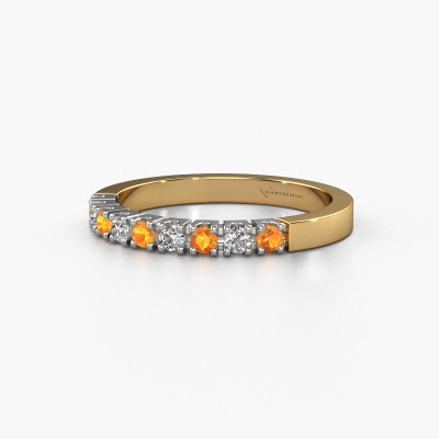 This extraordinary ring is called Dana 9. This type of ring is known as a memoire ring, because its gemstones are set in a continuous line. This makes it easy to combine with other rings. The band of this 14 Carat gold ring is set in a combination of citrin and diamond 2 mm. You can easily choose the combination you prefer online. As you can see, a single citrin is set in this single alliance gold ring. The memoire ring represents collaboration. And that is precisely what these gemstones do, collaborate. Together they add a beautiful effect to the band of a modern ring! Such a meaningful ring, wouldn't you agree? All our hand selected citrin are positioned by hand by our expert goldsmith. It's a precise task, which can only be completed successfully through the combination of pure craftsmanship and usage of the latest techniques which give it an optimal effect. To create a perfect reflection of light, all the gemstones have to be perfectly aligned in the same way. During manufacturing, the expert goldsmith will therefore monitor the reflection of light constantly to check whether the citrin are aligned properly. This requires a skilled hand and a lot of patience but then the end product will be a true piece of art. And that is our mission!After receiving your order, our goldsmiths will passionately start the creative process of making your ring in our own studio. Because we don't have a big stockpile, these costs will not be passed on to you. Our pricing is proof of that! We offer top quality jewels at lowest price, guaranteed.Our talented designers add new designs to our online collection daily. Together they create a diverse collection of the finest jewellery. If you prefer to make a ring according your own design, please feel free to request a quote. We will make you an amazing offer, based on quality and price.To make it easier for you, we offer a 30 day return policy. Check our terms and conditions.