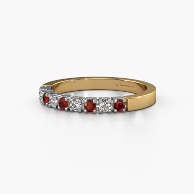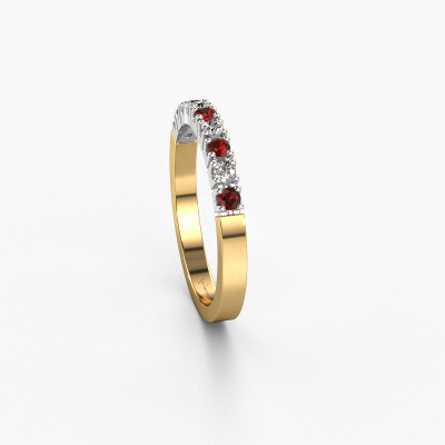 This extraordinary ring is called Dana 9. This type of ring is known as a memoire ring, because its gemstones are set in a continuous line. This makes it easy to combine with other rings. The band of this 14 Carat gold ring is set in a combination of garnet and diamond 2 mm. You can easily choose the combination you prefer online. As you can see, a single garnet is set in this single alliance gold ring. The memoire ring represents collaboration. And that is precisely what these gemstones do, collaborate. Together they add a beautiful effect to the band of a modern ring! Such a meaningful ring, wouldn't you agree? All our hand selected garnet are positioned by hand by our expert goldsmith. It's a precise task, which can only be completed successfully through the combination of pure craftsmanship and usage of the latest techniques which give it an optimal effect. To create a perfect reflection of light, all the gemstones have to be perfectly aligned in the same way. During manufacturing, the expert goldsmith will therefore monitor the reflection of light constantly to check whether the garnet are aligned properly. This requires a skilled hand and a lot of patience but then the end product will be a true piece of art. And that is our mission!After receiving your order, our goldsmiths will passionately start the creative process of making your ring in our own studio. Because we don't have a big stockpile, these costs will not be passed on to you. Our pricing is proof of that! We offer top quality jewels at lowest price, guaranteed.Our talented designers add new designs to our online collection daily. Together they create a diverse collection of the finest jewellery. If you prefer to make a ring according your own design, please feel free to request a quote. We will make you an amazing offer, based on quality and price.To make it easier for you, we offer a 30 day return policy. Check our terms and conditions.