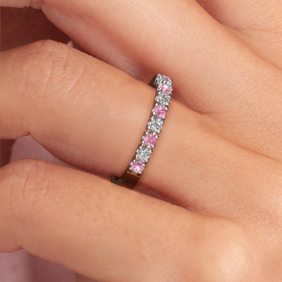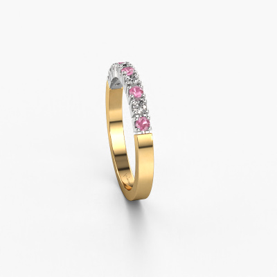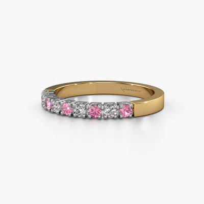 This extraordinary ring is called Dana 9. This type of ring is known as a memoire ring, because its gemstones are set in a continuous line. This makes it easy to combine with other rings. The band of this 14 Carat gold ring is set in a combination of pink sapphire and diamond 2 mm. You can easily choose the combination you prefer online. As you can see, a single pink sapphire is set in this single alliance gold ring. The memoire ring represents collaboration. And that is precisely what these gemstones do, collaborate. Together they add a beautiful effect to the band of a modern ring! Such a meaningful ring, wouldn't you agree? All our hand selected pink sapphire are positioned by hand by our expert goldsmith. It's a precise task, which can only be completed successfully through the combination of pure craftsmanship and usage of the latest techniques which give it an optimal effect. To create a perfect reflection of light, all the gemstones have to be perfectly aligned in the same way. During manufacturing, the expert goldsmith will therefore monitor the reflection of light constantly to check whether the pink sapphire are aligned properly. This requires a skilled hand and a lot of patience but then the end product will be a true piece of art. And that is our mission!After receiving your order, our goldsmiths will passionately start the creative process of making your ring in our own studio. Because we don't have a big stockpile, these costs will not be passed on to you. Our pricing is proof of that! We offer top quality jewels at lowest price, guaranteed.Our talented designers add new designs to our online collection daily. Together they create a diverse collection of the finest jewellery. If you prefer to make a ring according your own design, please feel free to request a quote. We will make you an amazing offer, based on quality and price.To make it easier for you, we offer a 30 day return policy. Check our terms and conditions.