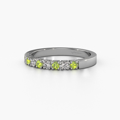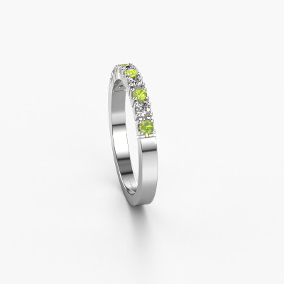 This extraordinary ring is called Dana 9. This type of ring is known as a memoire ring, because its gemstones are set in a continuous line. This makes it easy to combine with other rings. The band of this platinum ring is set in a combination of peridot and diamond 2 mm. You can easily choose the combination you prefer online. As you can see, a single peridot is set in this single alliance platinum ring. The memoire ring represents collaboration. And that is precisely what these gemstones do, collaborate. Together they add a beautiful effect to the band of a modern ring! Such a meaningful ring, wouldn't you agree? All our hand selected peridot are positioned by hand by our expert goldsmith. It's a precise task, which can only be completed successfully through the combination of pure craftsmanship and usage of the latest techniques which give it an optimal effect. To create a perfect reflection of light, all the gemstones have to be perfectly aligned in the same way. During manufacturing, the expert goldsmith will therefore monitor the reflection of light constantly to check whether the peridot are aligned properly. This requires a skilled hand and a lot of patience but then the end product will be a true piece of art. And that is our mission!After receiving your order, our goldsmiths will passionately start the creative process of making your ring in our own studio. Because we don't have a big stockpile, these costs will not be passed on to you. Our pricing is proof of that! We offer top quality jewels at lowest price, guaranteed.Our talented designers add new designs to our online collection daily. Together they create a diverse collection of the finest jewellery. If you prefer to make a ring according your own design, please feel free to request a quote. We will make you an amazing offer, based on quality and price.To make it easier for you, we offer a 30 day return policy. Check our terms and conditions.