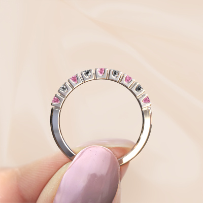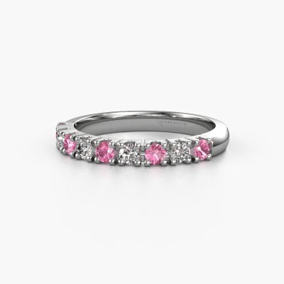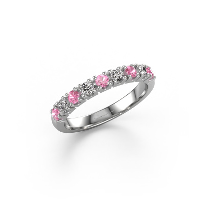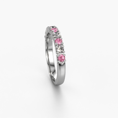 This extraordinary ring is called Rianne 9. This type of ring is known as a memoire ring, because its gemstones are set in a continuous line. This makes it easy to combine with other rings. The band of this platinum ring is set in a combination of pink sapphire and diamond 2.4 mm. You can easily choose the combination you prefer online. As you can see, a single pink sapphire is set in this single alliance platinum ring. The memoire ring represents collaboration. And that is precisely what these gemstones do, collaborate. Together they add a beautiful effect to the band of a classic ring! Such a meaningful ring, wouldn't you agree? All our hand selected pink sapphire are positioned by hand by our expert goldsmith. It's a precise task, which can only be completed successfully through the combination of pure craftsmanship and usage of the latest techniques which give it an optimal effect. To create a perfect reflection of light, all the gemstones have to be perfectly aligned in the same way. During manufacturing, the expert goldsmith will therefore monitor the reflection of light constantly to check whether the pink sapphire are aligned properly. This requires a skilled hand and a lot of patience but then the end product will be a true piece of art. And that is our mission!Are you on a budget? Please feel free to contact us, so we can go discuss your options. We offer our rings at guaranteed best price, because we make them to order. You won't find such a price anywhere else!