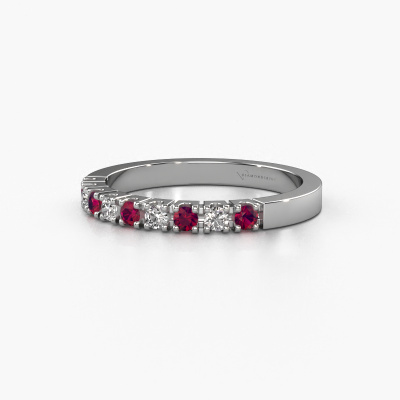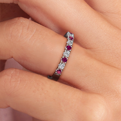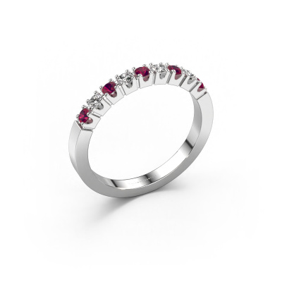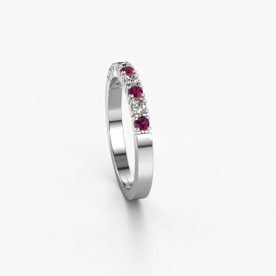 This extraordinary ring is called Dana 9. This type of ring is known as a memoire ring, because its gemstones are set in a continuous line. This makes it easy to combine with other rings. The band of this platinum ring is set in a combination of rhodolite and diamond 2 mm. You can easily choose the combination you prefer online. As you can see, a single rhodolite is set in this single alliance platinum ring. The memoire ring represents collaboration. And that is precisely what these gemstones do, collaborate. Together they add a beautiful effect to the band of a modern ring! Such a meaningful ring, wouldn't you agree? All our hand selected rhodolite are positioned by hand by our expert goldsmith. It's a precise task, which can only be completed successfully through the combination of pure craftsmanship and usage of the latest techniques which give it an optimal effect. To create a perfect reflection of light, all the gemstones have to be perfectly aligned in the same way. During manufacturing, the expert goldsmith will therefore monitor the reflection of light constantly to check whether the rhodolite are aligned properly. This requires a skilled hand and a lot of patience but then the end product will be a true piece of art. And that is our mission!After receiving your order, our goldsmiths will passionately start the creative process of making your ring in our own studio. Because we don't have a big stockpile, these costs will not be passed on to you. Our pricing is proof of that! We offer top quality jewels at lowest price, guaranteed.Our talented designers add new designs to our online collection daily. Together they create a diverse collection of the finest jewellery. If you prefer to make a ring according your own design, please feel free to request a quote. We will make you an amazing offer, based on quality and price.To make it easier for you, we offer a 30 day return policy. Check our terms and conditions.