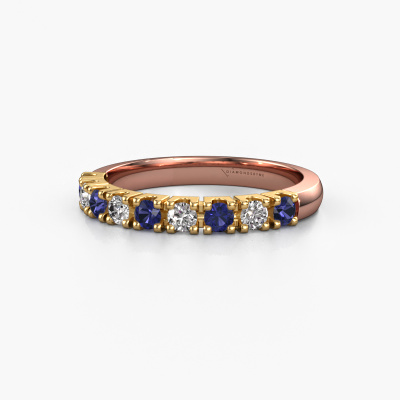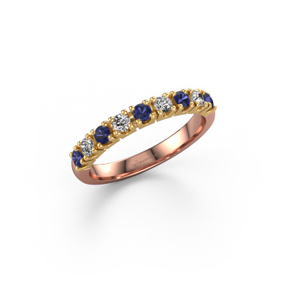 This extraordinary ring is called Rianne 9. This type of ring is known as a memoire ring, because its gemstones are set in a continuous line. This makes it easy to combine with other rings. The band of this 14 Carat rose gold ring is set in a combination of sapphire and diamond 2.4 mm. You can easily choose the combination you prefer online. As you can see, a single sapphire is set in this single alliance rose gold ring. The memoire ring represents collaboration. And that is precisely what these gemstones do, collaborate. Together they add a beautiful effect to the band of a classic ring! Such a meaningful ring, wouldn't you agree? All our hand selected sapphire are positioned by hand by our expert goldsmith. It's a precise task, which can only be completed successfully through the combination of pure craftsmanship and usage of the latest techniques which give it an optimal effect. To create a perfect reflection of light, all the gemstones have to be perfectly aligned in the same way. During manufacturing, the expert goldsmith will therefore monitor the reflection of light constantly to check whether the sapphire are aligned properly. This requires a skilled hand and a lot of patience but then the end product will be a true piece of art. And that is our mission!Are you on a budget? Please feel free to contact us, so we can go discuss your options. We offer our rings at guaranteed best price, because we make them to order. You won't find such a price anywhere else!