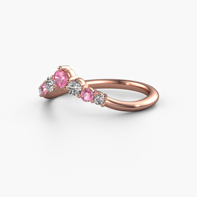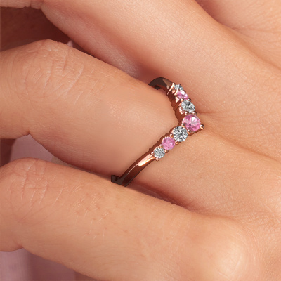 This Imani B stackable ring in 14 Carat rose gold is set with pink sapphire. This rose gold stacked Imani B ring is the perfect addition to your ring collection! As the name suggests, it is a ring which can be combined on one finger with another ring. It gives you the opportunity to create your own style. A stacked ring usually represents a certain memory of someone special or a memorable moment. It is common to combine a stacked ring, representing an anniversary, with a wedding ring. But this beautiful ring, combined with your other rings, also makes a classy fashion item. Our goldsmiths passionately create your customized stackable ring to your liking with the utmost care. The rose gold stackable ring, as shown here, can be customized using our online tool. Feel free to ask our jewel designers for assistance if you want changes made which are unavailable in our online tool. We are happy to answer your questions.By using a combination of the latest modern techniques, combined with ancient crafting, we can make all our rings in our own studio. Each jewel is made to order. This is advantageous because we can offer you a price you won't find anywhere else.To make it easier for you, we offer a 30 day return policy. Check our terms and conditions.