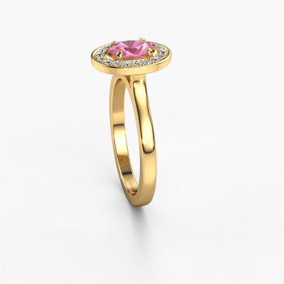 The ring shown above is called Madelon 1. This type of ring is known as a solitaire ring. The 14 Carat gold ring is set with a 7x5 mm oval pink sapphire centre stone surrounded by smaller sized diamonds. This best price gold halo ring, is set with a big pink sapphire embraced by smaller sized gemstones. The ring got its name for its halo which the smaller sized diamonds help create. In order to achieve a stunning halo, these smaller sized gemstones have to be aligned perfectly so light reflects evenly on the pink sapphire from every angle. And our expert goldsmiths get the job done. Each carefully selected pink sapphire is set by hand with utmost precision. During manufacturing, light fall is constantly monitored to make sure the special halo effect is still visible. In the end you get a unique ring with a radiant pink sapphire gemstone centrepiece. An exquisite ring indeed! The best part of this best price ring is that you can customize it to your own liking. Your style, your choice, your ring. On top of that, your classic gold ring will be made by hand with eco-friendly materials! Please feel free to easily customize the ring, using our online tool.Are you on a budget? Please feel free to contact us, so we can go discuss your options. We offer our rings at guaranteed best price, because we make them to order. You won't find such a price anywhere else!To make it easier for you, we offer a 30 day return policy. Check our terms and conditions.
